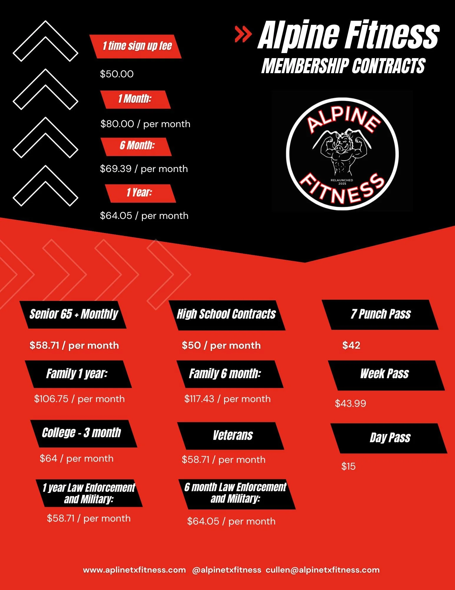 Our memberships Individual Monthly Membership$80 Individual 1 Year:$64.05 Family (2 People) Monthly 1 year contract$106.75 Individual Week Pass$43.99 Individual 6 Months$69.39 Day Pass$15 In office only deals available! high school and college contract