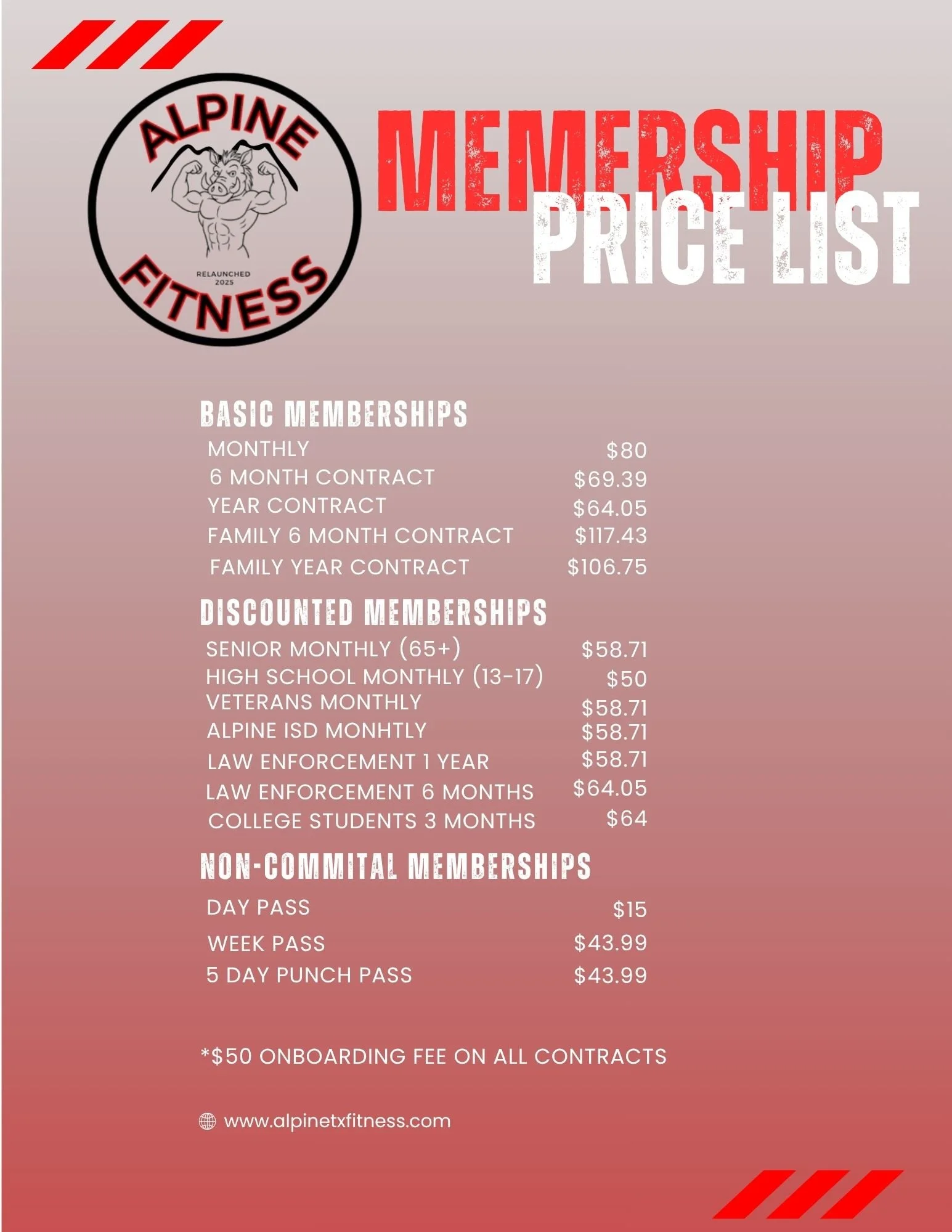Our memberships Individual Monthly Membership$80 Individual 1 Year:$64.05 Family (2 People) Monthly 1 year contract$106.75 Individual Week Pass$43.99 6 month family (2 people) contract$43.99 Individual 6 Months$69.39 Day Pass$15 In office only deals available! high school and college contract